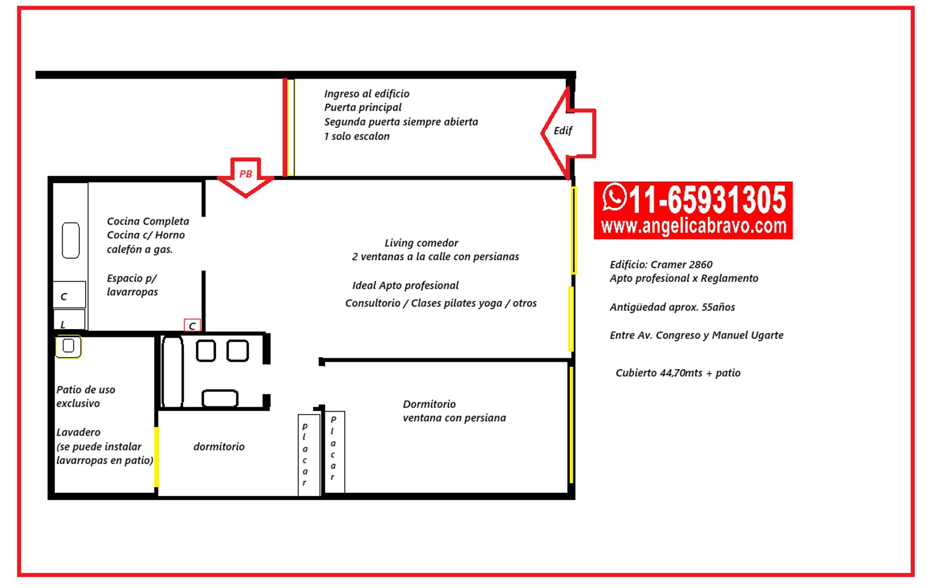 Excelente departamento tipo PH , muy buena ubicación de Belgrano / nuñez BELGRANO PB FRENTE - APTO VIVIENDA, PROFESIONAL - IDEAL CONSULTORIO / OFICINA CLASES DE PIALTES / YOGA OTROS Superficie Cubierto 44,70mts + patio. VER PLANO EN FOTOS Expensas incluye AYSA dpto. $90.000.- Limpieza externa Living comedor , 4,10x3,20 más Hall de entrada 2,42x1.36 Con 2 ventanas a la calle con persiana. Amplia Cocina completa - 2,37x2,33 COCINA CON HORNO Y CALEFON A GAS Espacio para lavarropas (lavarropas venta a negociar) Patio 3,90 x 1,37 con lavadero (se puede instalar lavarropas) Dormitorio con ventana al patio 3,10x 2 con Placar 1,13x0,30 Dormitorio ventanas con persiana al frente 3,10x3,20 con Placar 2,13x0,70 Baño completo 2,10x1,65 visitas coordinar Angelica Bravo matricula 5096 CUCICBA