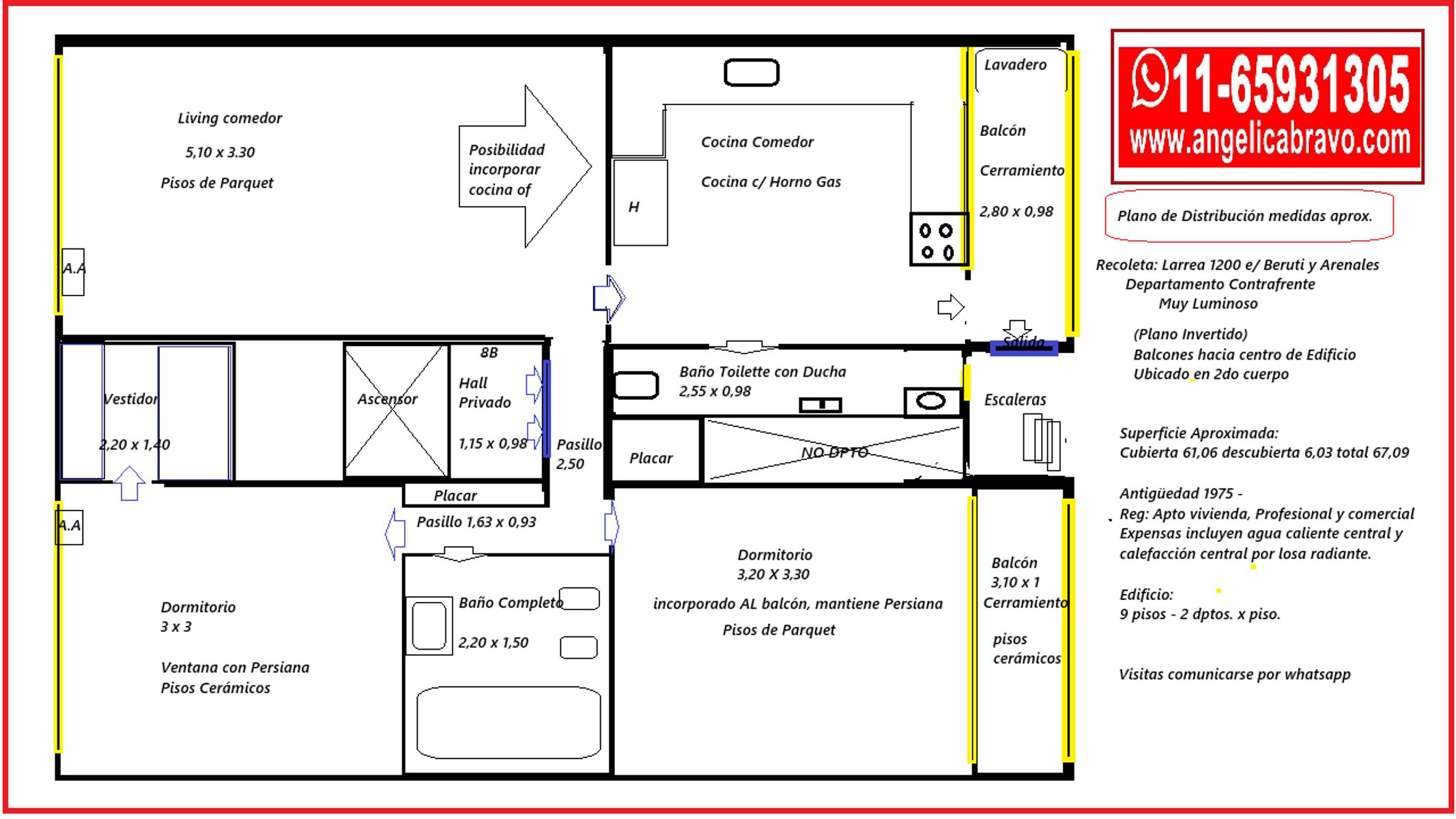 Departamento 3 ambientes con Baño y Toilette, 2 balcones APTO CREDITO - EXCELENTE INVERSION Superficie Cubierta 61,06 descubierta 6,03 total 67,09 ver plano de distribución en fotos Antigüedad 1975 - Reglamento: Apto vivienda, Profesional y comercial Expensas incluyen agua caliente central y calefacción central por losa radiante. Larrea entre Arenales y Beruti en una de las zonas mas comodas para vivir, por la proximidad a diferentes medios de transporte y espacios verdes. Esta a tan solo 150 metros de Avda. Santa Fe y de Avda. Pueyrredón con el cruce de las lines de subte D y H. a pocas cuadras de Avda. Las Heras proximo a universidades, shopings y espacio de esparcimiento y zona de restaurantes. Edificio de unos 50 años de antiguedad, de 9 pisos, dos cuerpos. 2/3 x piso. El departamento esta en el segundo cuerpo al contrafrente del edificio. Hall de entrada privado, directo del ascensor living comedor, cocina completa amplia con toilete c/ ducha y con salida a balcón convertido en lavadero y salida a escaleras de servicio. Pasillo interior con placar. Dormitorio principal con vestidor. segundo dormitorio con salida a balcón (hoy cubierto y cerrado). Baño completo con bañera. ideal para familias, apto profesional o estudiantes por su excelente ubicación y con muy buena luz natural. Contrafrente con Orientación: Noreste Info: Vencimiento Noviembre.: Expensas de octubre, vencen incluyen agua caliente central y calefacción central por losa radiante y extraord. ascensor $267.000.- // ABL octubre $54.000.- /// AYSA octubre $30.000.- /// Edesur y Metrogas s/c Observaciones NO apto para personas con movilidad reducida ley 5115 Las medidas exactas surgen del titulo de propiedad. Comercializa Angelica Bravo matricula 5096 CUCICBA Las fotos son ilustrativas, de carácter no contractual El valor actual de las expensas es aproximado (sujeto a variaciones del consorcio) El precio del inmueble puede ser modificado. Toda información es a efecto orientativo. Las descripciones arquitectónicas y funcionales, valores de expensas, impuestos y servicios, fotos y medidas de este inmueble son aproximados. Los datos fueron proporcionados por el propietario y pueden no estar actualizados a la hora de la visualización de este aviso por lo cual pueden arrojar inexactitudes y discordancias con las que surgen de los las facturas, títulos y planos legales del inmueble. El interesado deberá realizar las verificaciones respectivas previamente a la realización de cualquier operación, requiriendo por sí o sus profesionales las copias necesarias de la documentación que correspondiente Comercializa Angelica Bravo matricula 5096 CUCICBA